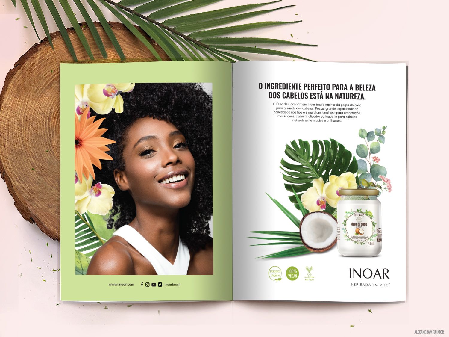 Natural Coconut Oil, the perfect ingredient for hair beauty is in nature. Transparent glass was chosen to visualize the product and interact with the label, which was designed with delicate watercolor illustrations of the coconut and leaves. Application in magazines and social media.